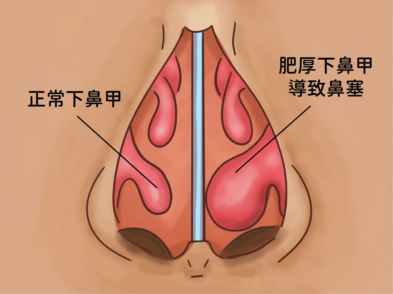 台灣有不少長期為鼻塞所困擾,鼻塞的原因很多,其中最常見的就是長期過敏性炎所引起的慢性肥厚性鼻炎。慢性肥厚性鼻炎病⼈的下鼻甲因長期發炎而產⽣過度肥大的現象,肥大的下鼻甲阻塞了鼻腔內的空氣流通,引起鼻塞的症狀。