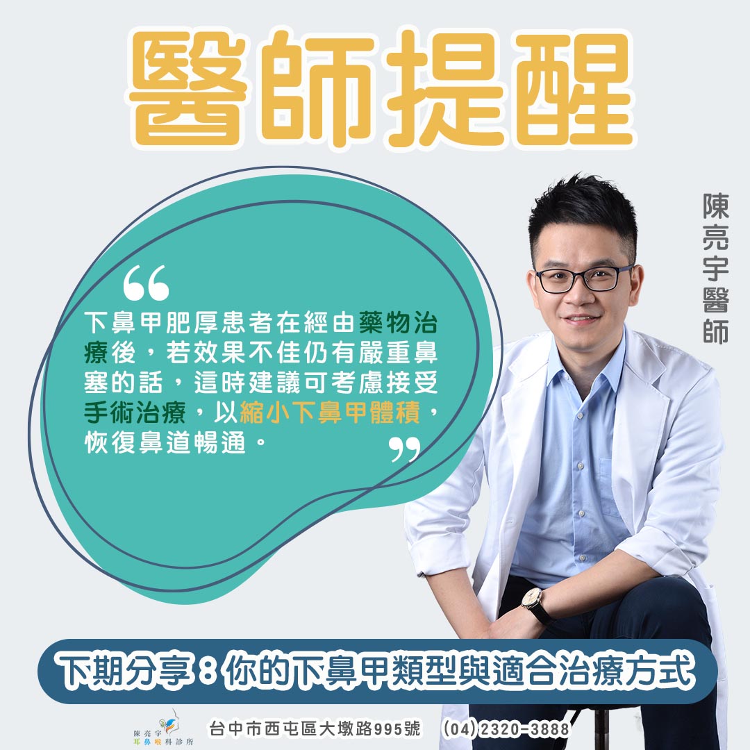 ❙下鼻甲肥厚患者在經由藥物治療後,若效果不佳仍有嚴重症狀的話,建議可考慮接手術治療,根據不同類型有不同建議治療方式(下期分享)