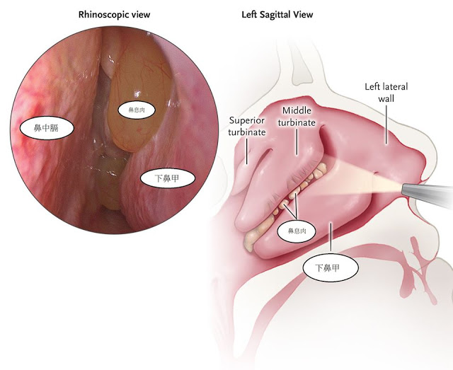而鼻息肉則是與鼻肉腫大完全不同的唷,鼻息肉在正常上、中、下鼻甲之間另外長出來的一種增生性組織,所以外觀呈現乳白色,一般直接檢視鼻孔是無法看到,必須以鼻內窺鏡、鼻內視鏡確診。
