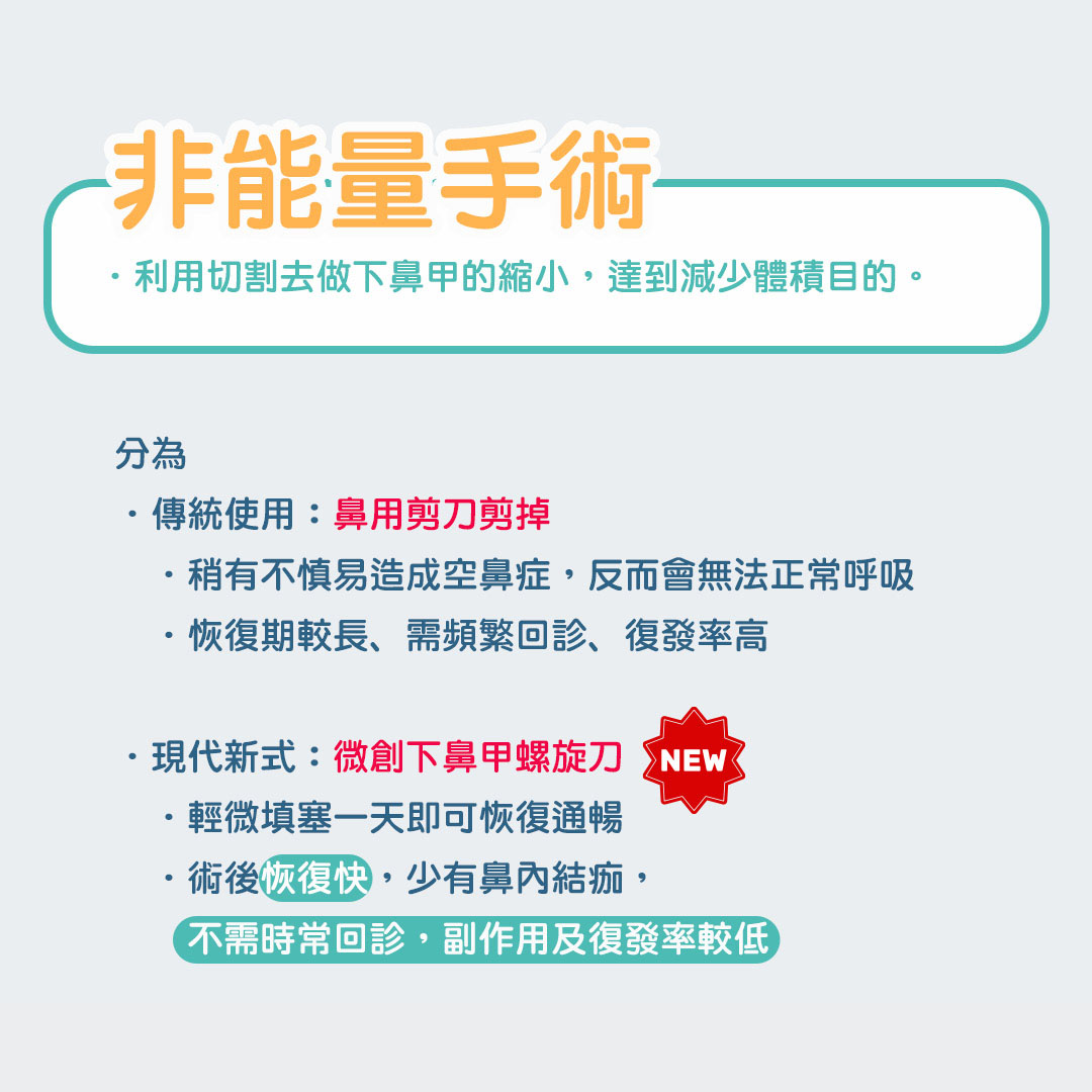 微創下鼻甲螺旋刀,有經驗的醫師能夠利用螺旋刀來移除肥厚的鼻甲骨,幫助鼻部通暢。黏膜保留完整,術後恢復速度快,少有鼻內結痂,亦不需時常回診,缺點就是需要忍耐短暫一天的鼻填塞不舒服感!