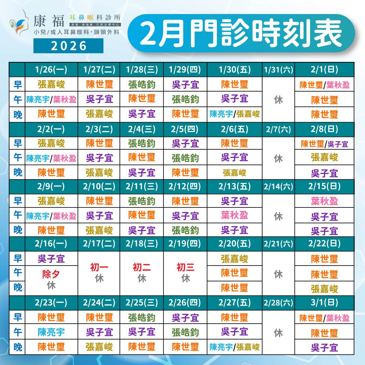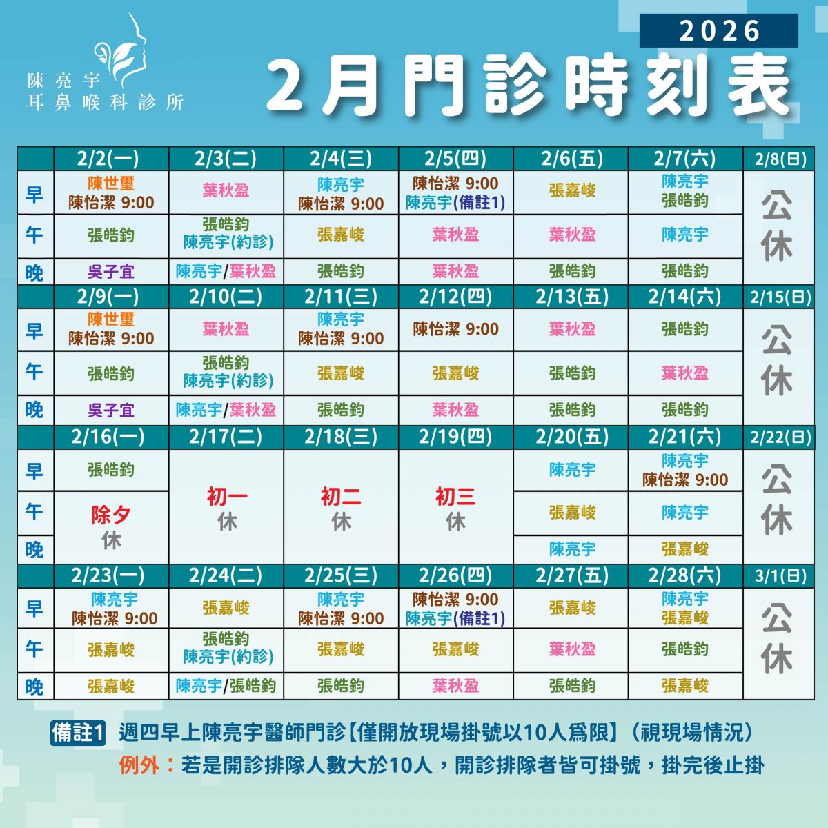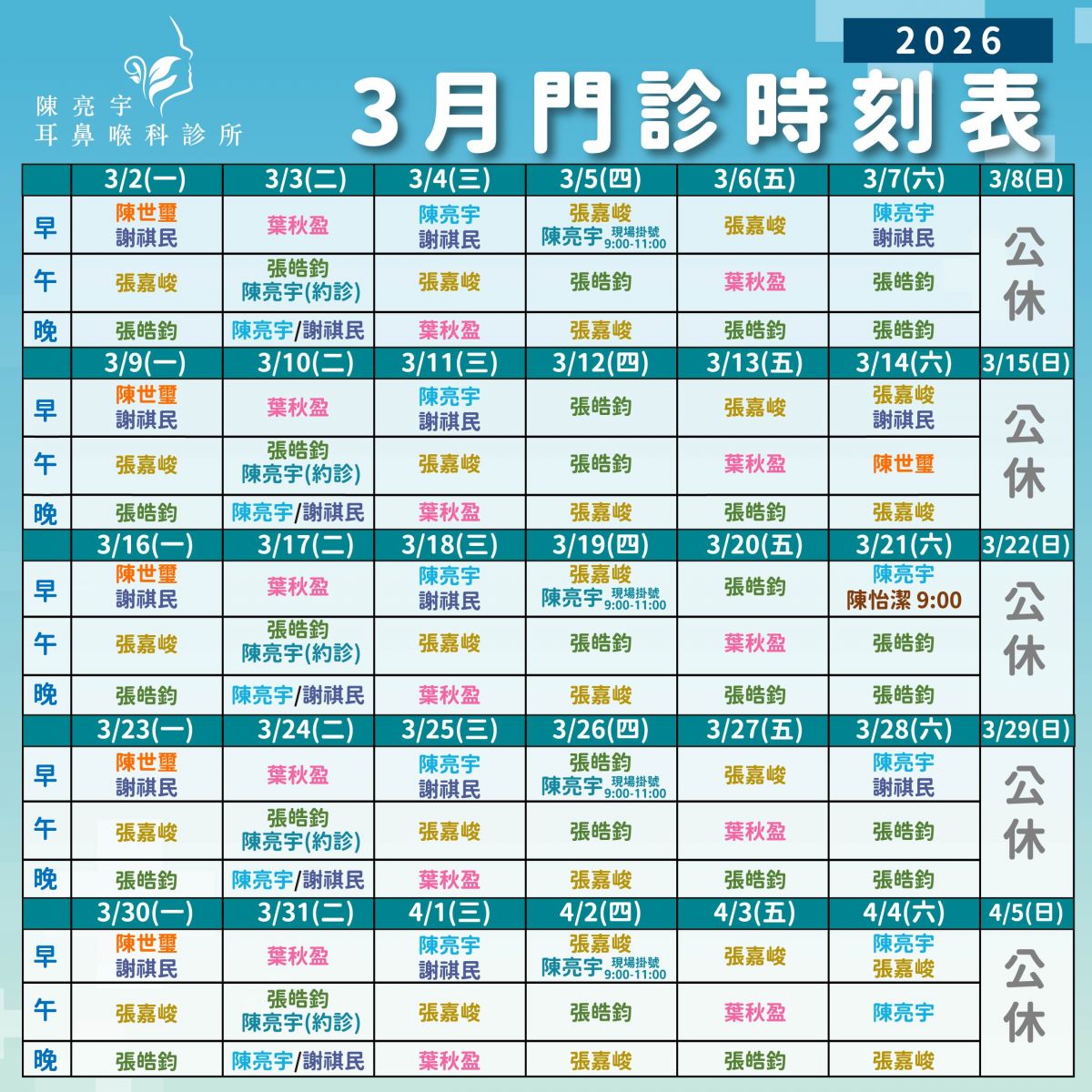 陳亮宇耳鼻喉科 最新門診異動請點此